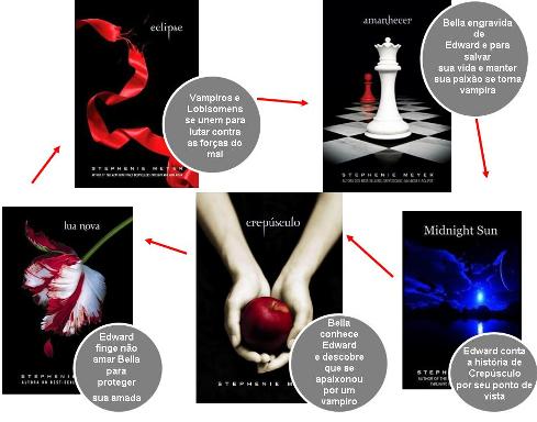 A saga Crepúsculo é composta por 5 livros: Crepúsculo(Twilight), Lua Nova(NewMoon), Eclipse, Amanhecer(Breaking Dawn), Sol da Meia Noite.